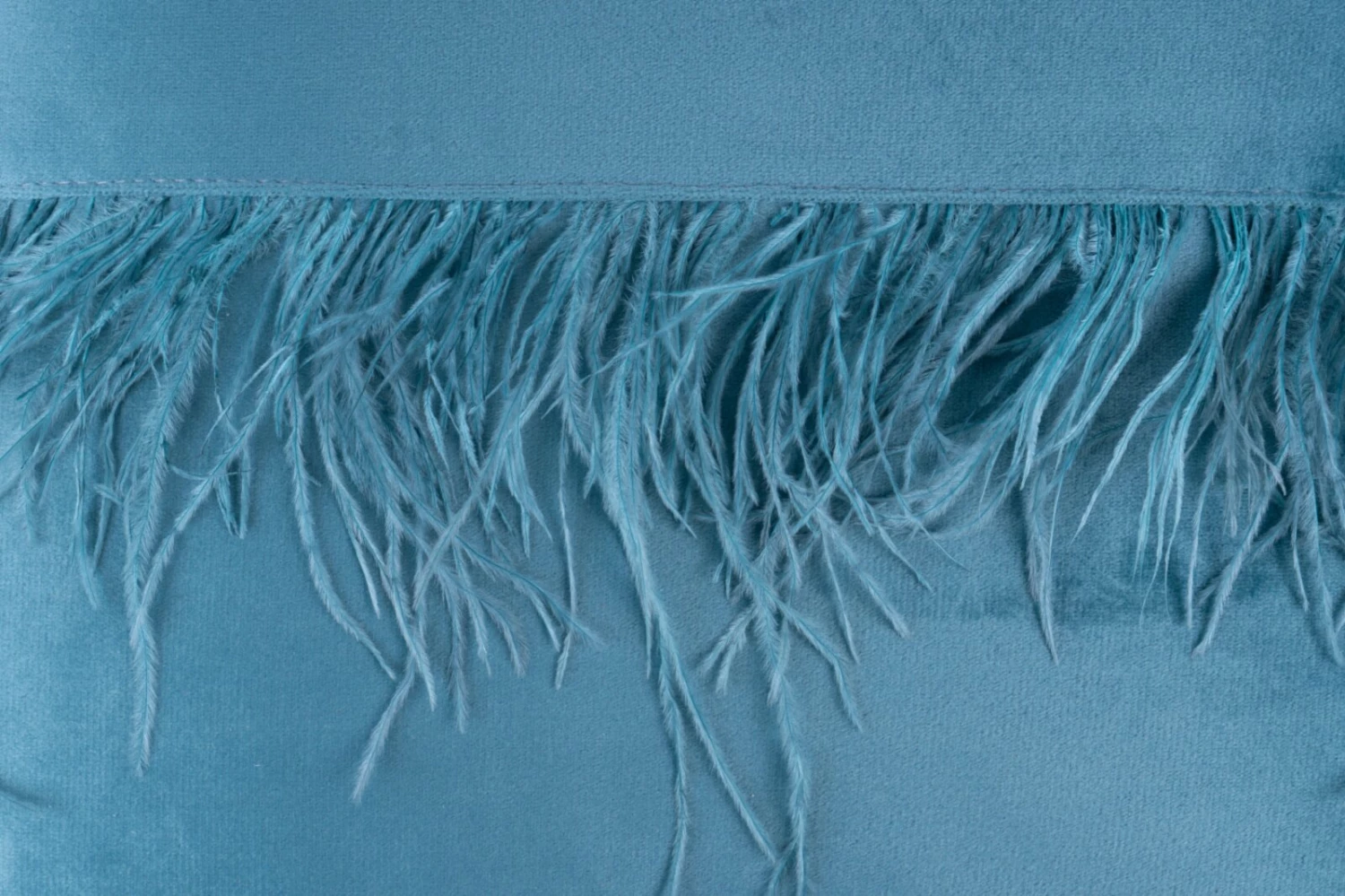Moderne Dekokissen in Aquablau mit attraktiven Zierfedern. Die dekorativen Kissen erhalten ihren einmaligen Touch durch einen Besatz aus Straußenfedern. Die Rückseite ist schlicht gehalten. Die weichen Kissenbezüge laden zum Verleihen auf dem heimischen Sofa ein.