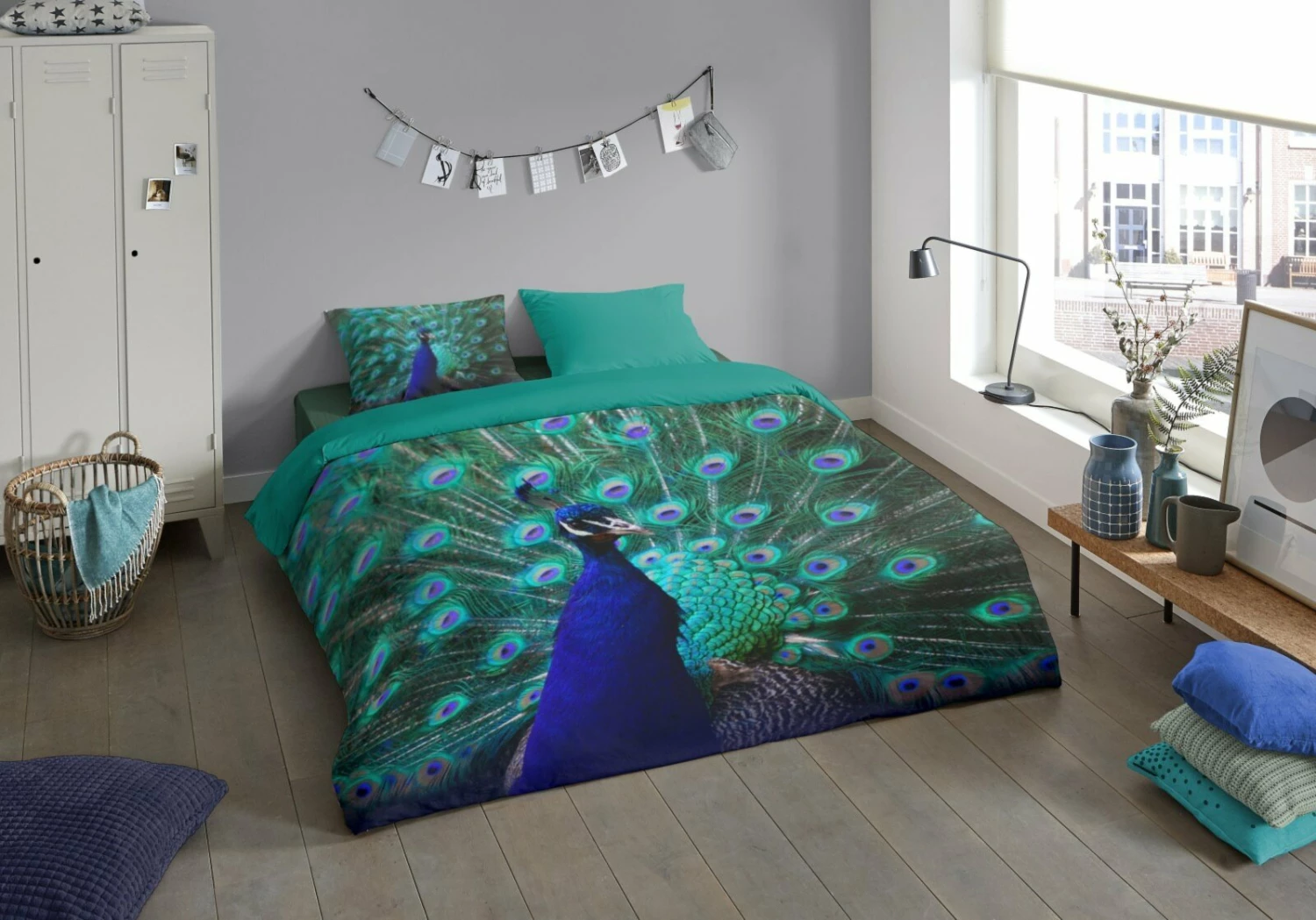 Wunderschön, wie der Pfau präsentiert sich diese Bettwäsche in kräftigen Farben! Die Augen auf dem Federkleid gläzen wundervoll. Bei dieser Bettwäsche handelt es sich um eine Wendebettwäsche. Dies bedeutet, dass Sie jeden Tag aufs Neue entscheiden können, ob ein Kissen und die Bettdecke in durchgehendem Petrol Ihr Bett zieren soll oder aber dies mit der Pfauen Abbildung ergänzen. Das Set ist mit Reißverschluss ausgestattet, so dass der Wechsel schnell stattfinden kann.