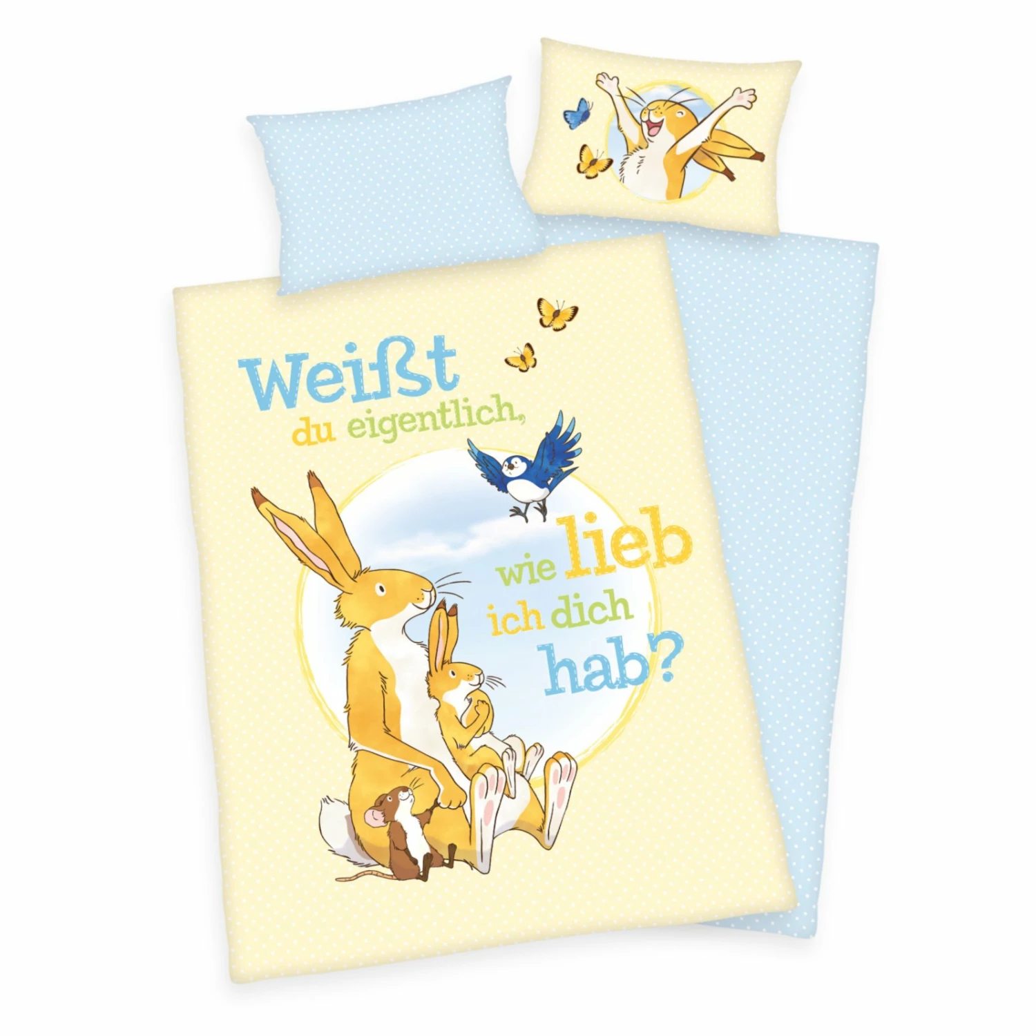 Die Bettwäsche „Weißt du eigentlich, wie lieb ich dich hab?“ besteht zu 100% aus BIO-Baumwolle. Das kinderfreundliche Motiv ist ein echter Hingucker und der Renforcé-Stoff fühlt sich angenehm weich auf der Haut an.