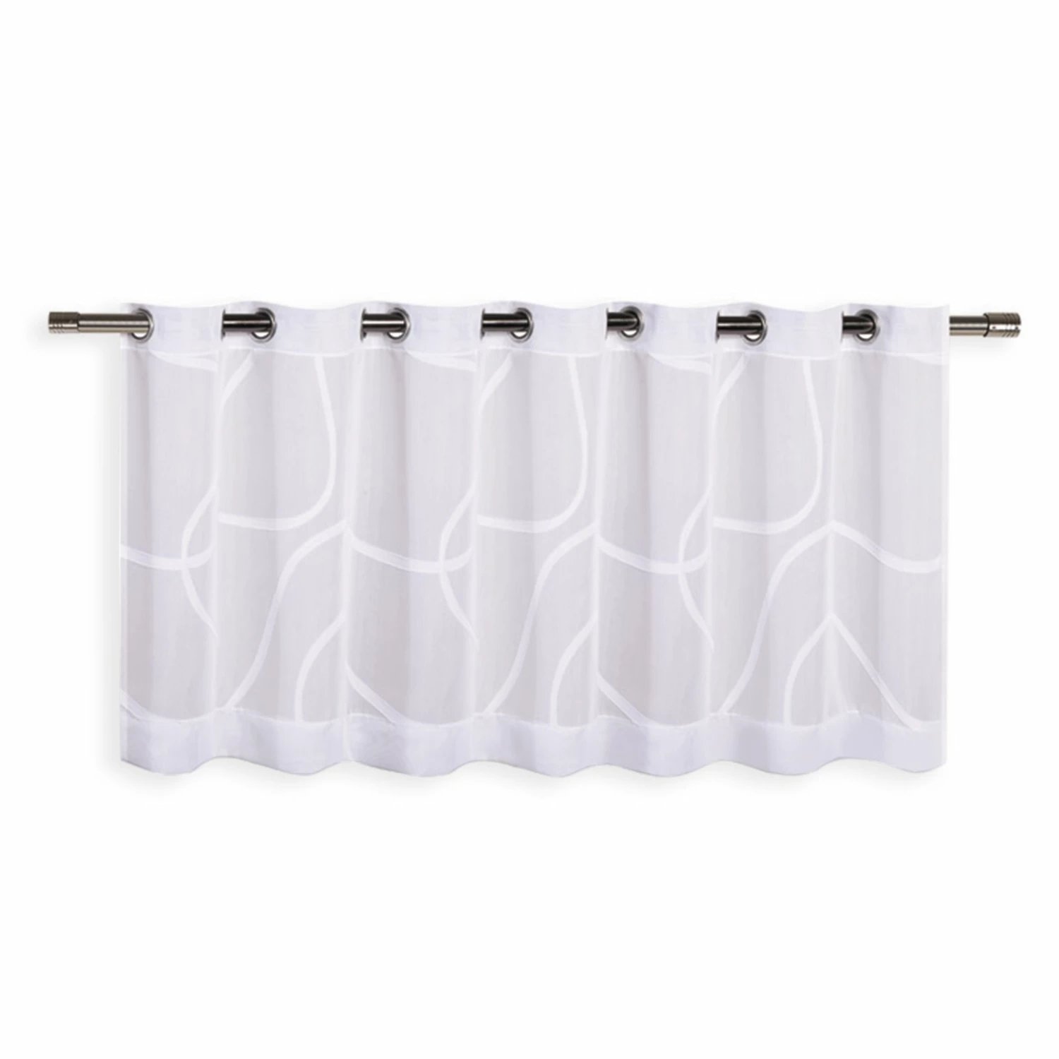 Bistro-Gardine in Weiß mit dezentem Muster. Über die Ösenaufhängung lässt sich die Gardine ganz einfach auf einer Gardinenstange befestigen. Ein stilvoller Blickfang für Ihre Fenster.