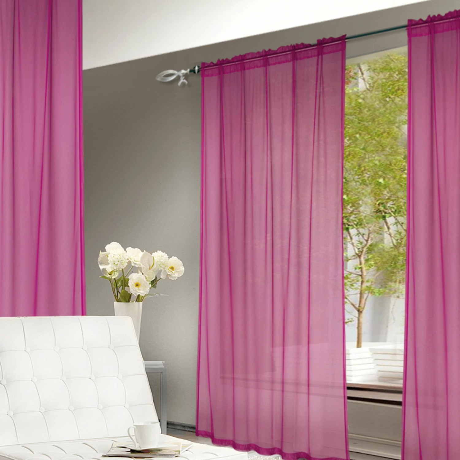 Der Fertigschal ist transparent. Er verleiht Ihrem Fenster das gewisse Etwas, setzt schöne Akzente und lässt dabei weiterhin Ihren Raum von Licht durchfluten. Bringen Sie frischen Wind an Ihre Fenster.
