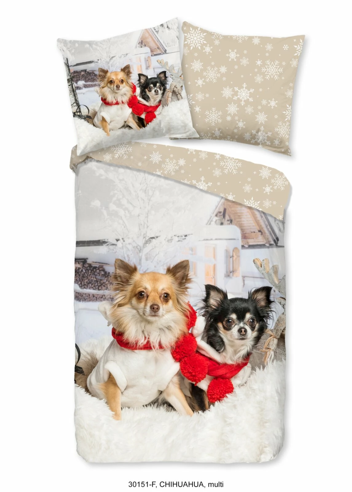 Freuen Sie sich auf diese herrliche Winterbettwäsche. Die schöne Winterzeit wird mit zwei süßen Hunden abgebildet. Dabei können Sie das Motiv wenden, um eine beigefarbene Bettwäsche mit schönem Schneeflockenmuster zu erhalten.