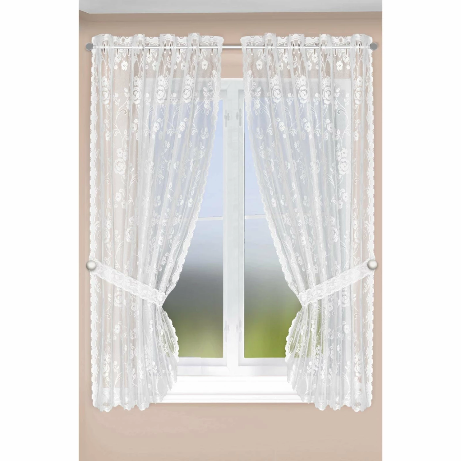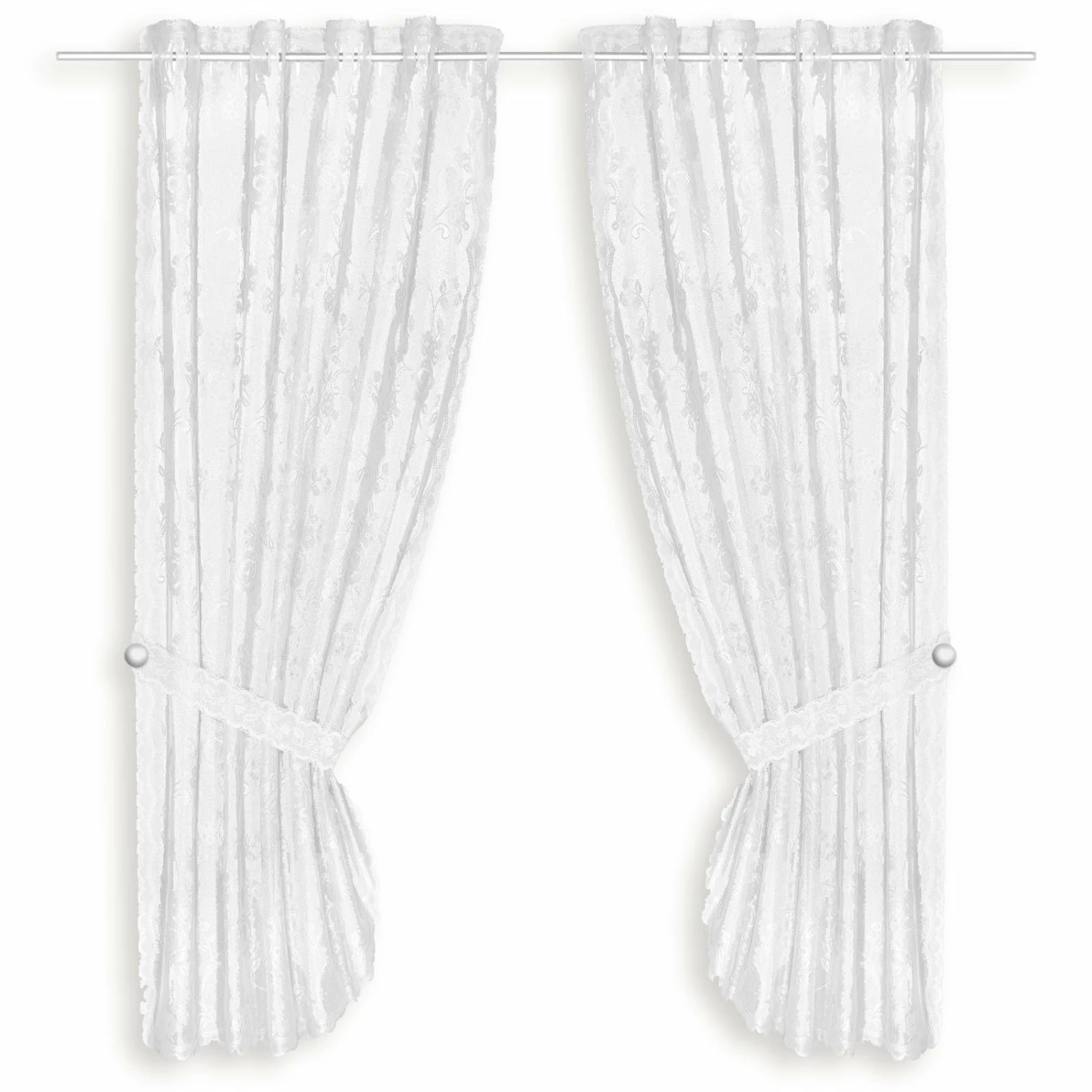 Dieses weiße Gardinen-Set wird für charmantes Wohnambiente in Ihren vier Wänden sorgen. Die Raffhalter sind im Lieferumfang mit inbegriffen, sodass Sie den transparenten Stoff festbinden können.