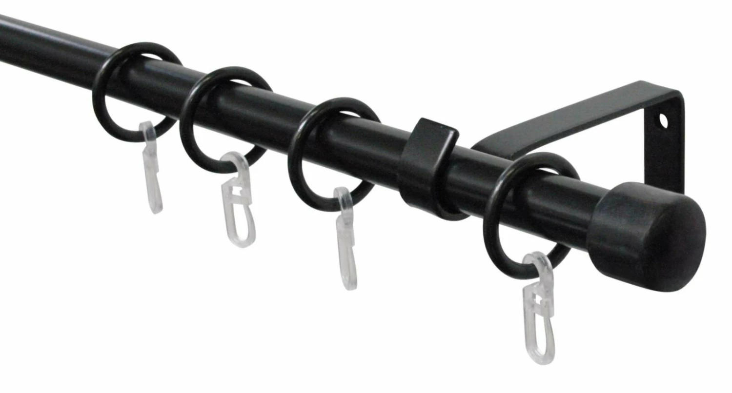 Gardinenstange, Metall-Träger, Kunststoff-Endstücke, Kunststoff-Ringe mit Faltenlegehaken