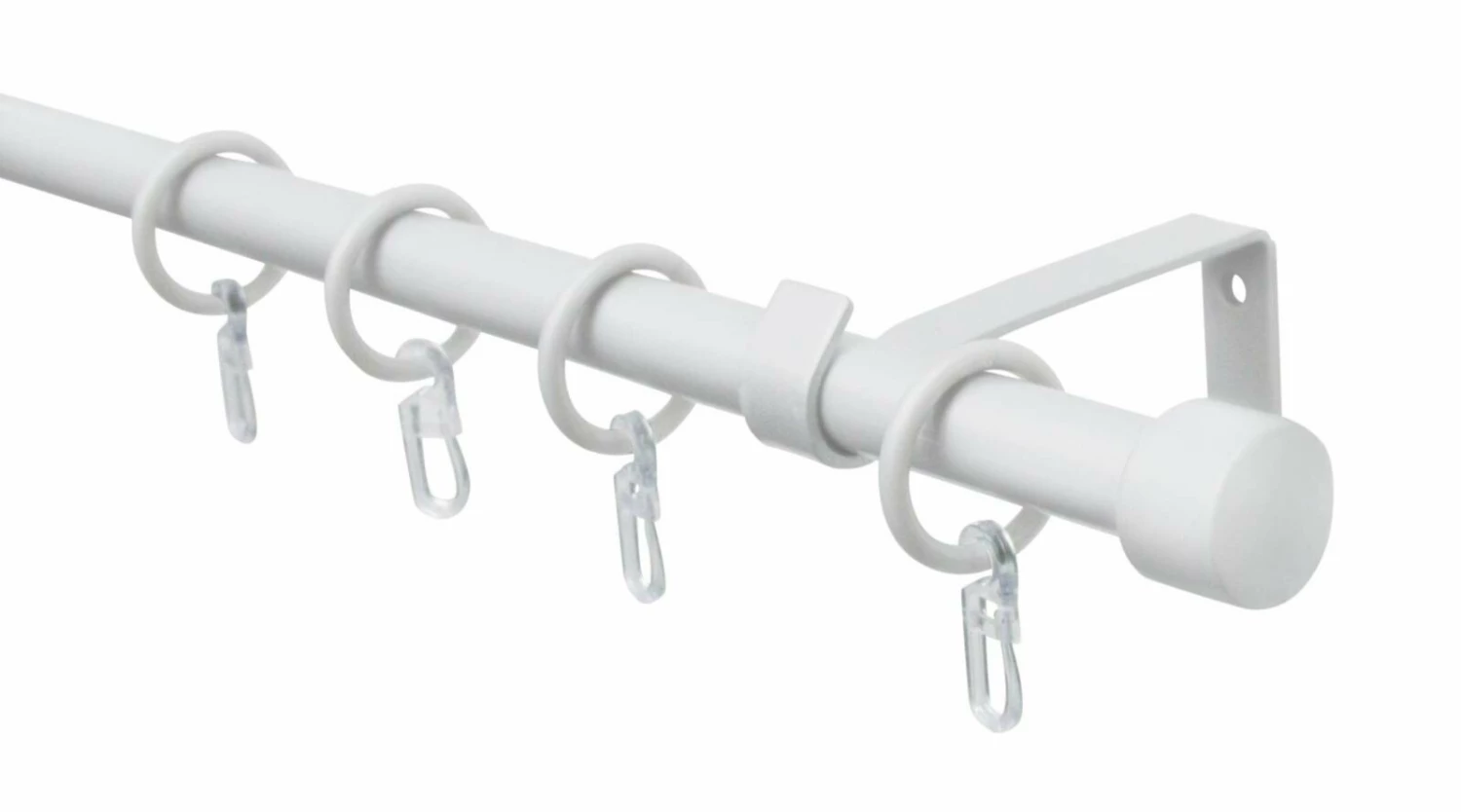 Gardinenstange, Metall-Träger, Kunststoff-Endstücke, Kunststoff-Ringe mit Faltenlegehaken