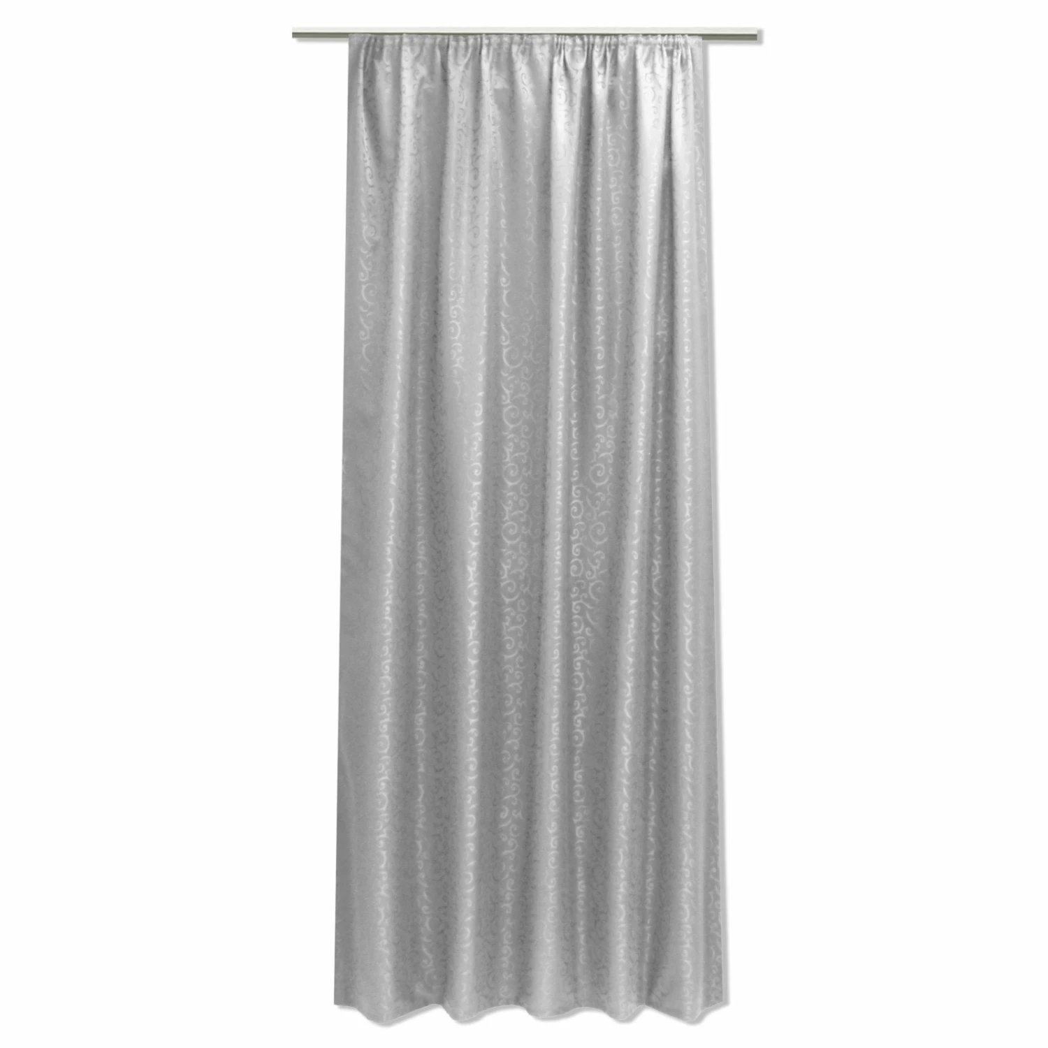 Blickdichter Vorhang im Jacquardmuster mit Gardinenband. Die silberne Oberfläche wirkt in Verbindung mit der Musterung sehr edel und erzeugt somit ein tolles Gesamtbild.