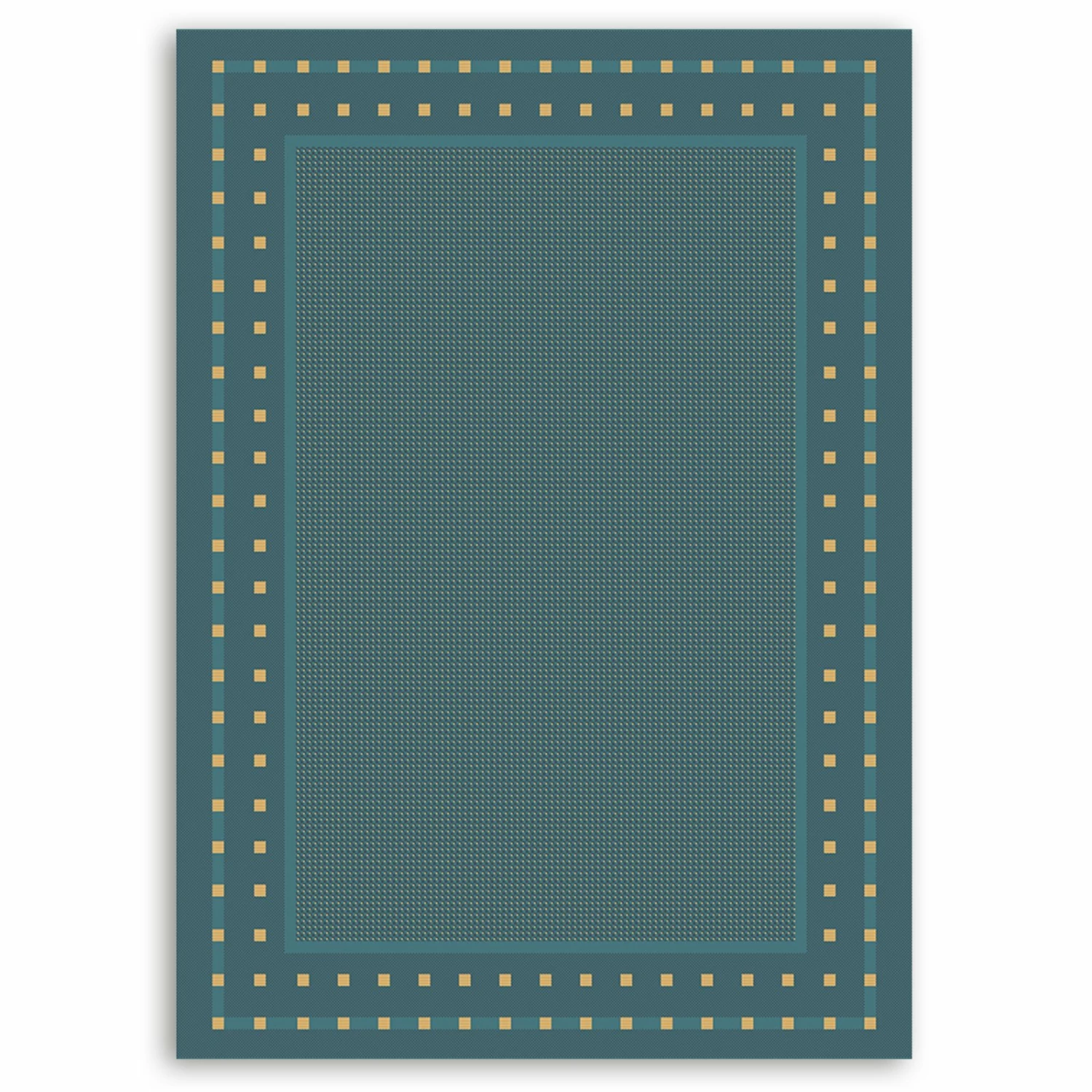 Schicker graublauer Teppich mit gelb gemustertem Rand. Das Muster wirkt sehr modern und die Maße eignen sich perfekt für mittelgroße Räume.