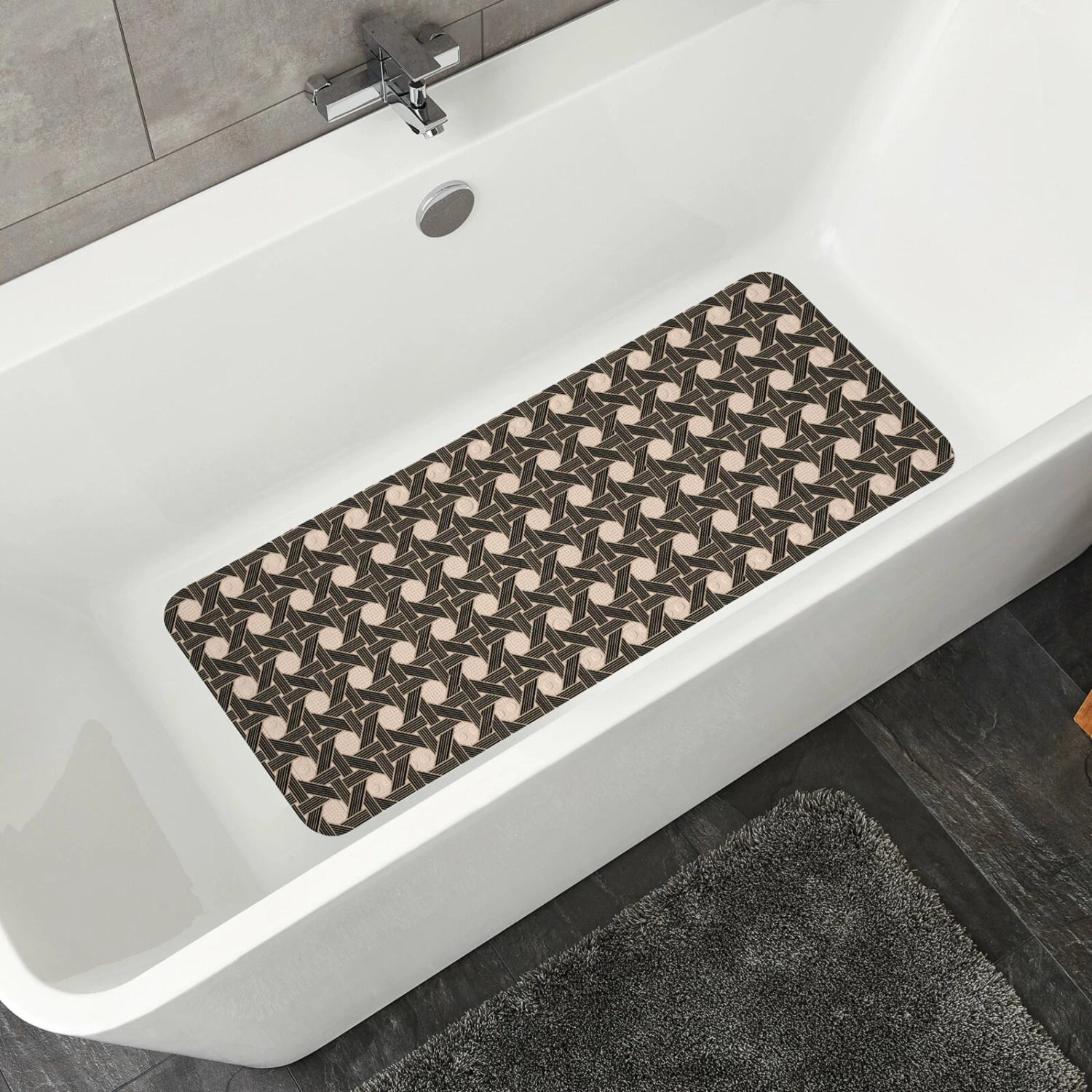 Die rutschhemmende Wanneneinlage in Taupe-Schwarz ist ein nützliches und vorallem modernes Utensil für deine Badewanne. Die Einlage ist etwa 36 cm breit und 92 cm hoch.