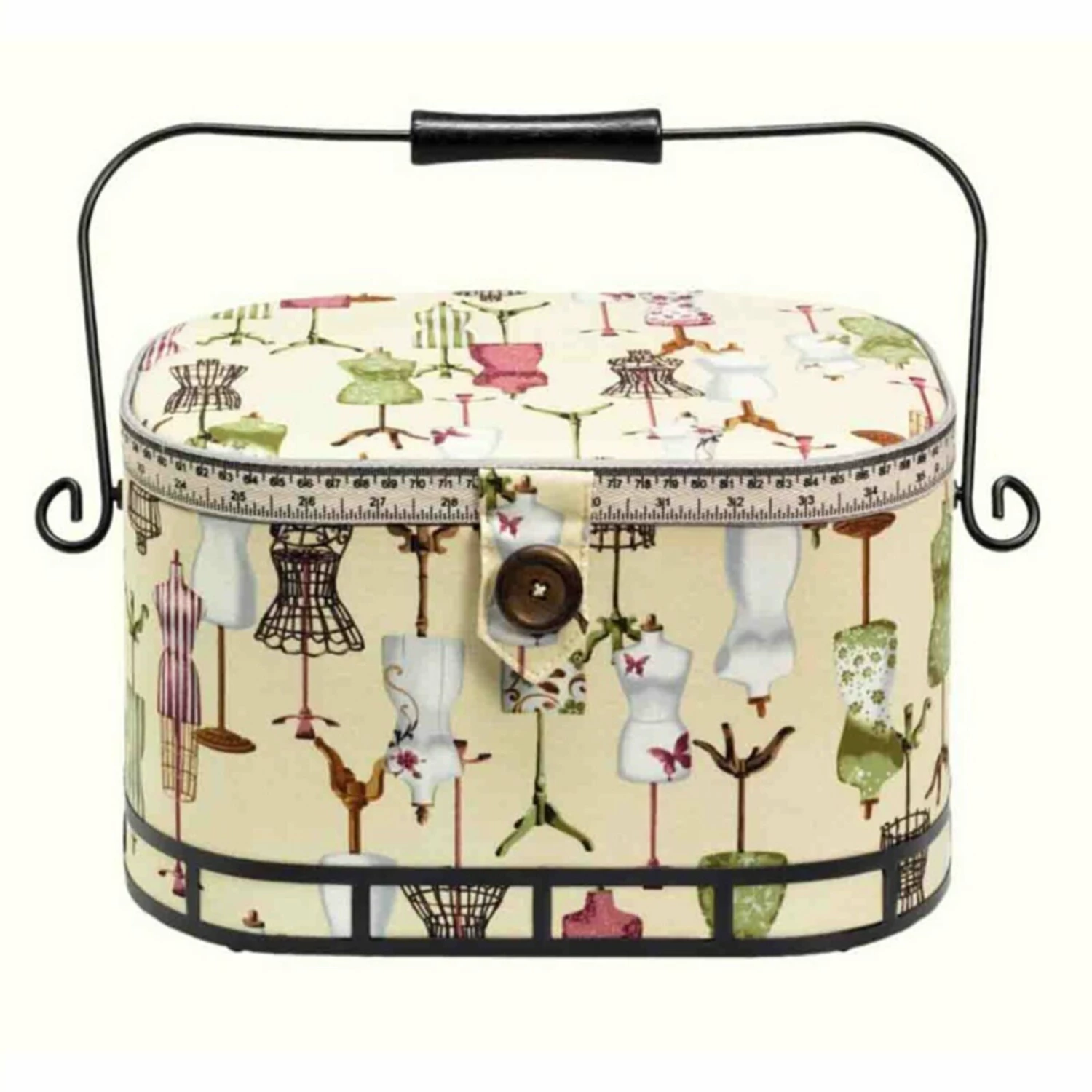 Der besondere Eisengriff und das Schneiderbüsten-Muster machen diesen Nähkorb zum echten Hingucker! Die tolle Optik, sowie die Stauraummöglichkeiten machen dieses Accessoire zum absoluten Must-Have für alle Näh-Begeisterte! Durch den herausnehmbaren Kunststoffeinsatz steht für Ihr Nähzubehör eine optimale Unterteilung zur Verfügung.