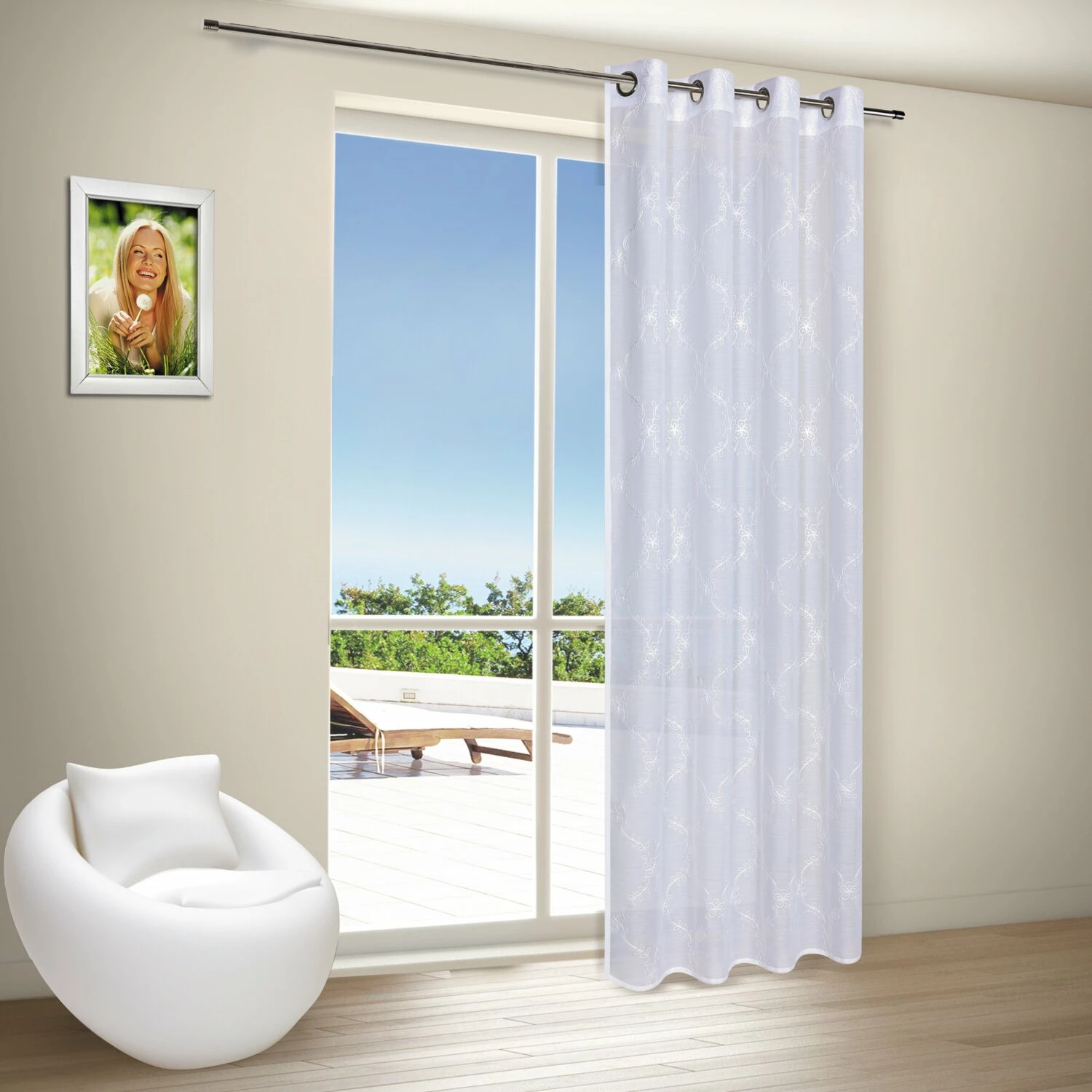 Der Ösenschal in Weiß aus transparenter Grundware ist all Over bestickt. Die moderne, pflegeleichte Gardine kann über die Metallösen auf jede herkömmliche Gardinenstange aufgefädelt werden. Dank seiner schlichten Art, passt sich der Vorhang jedem Einrichtungsstil an und wirkt als tolles lichtdurchlässiges Accessoire.