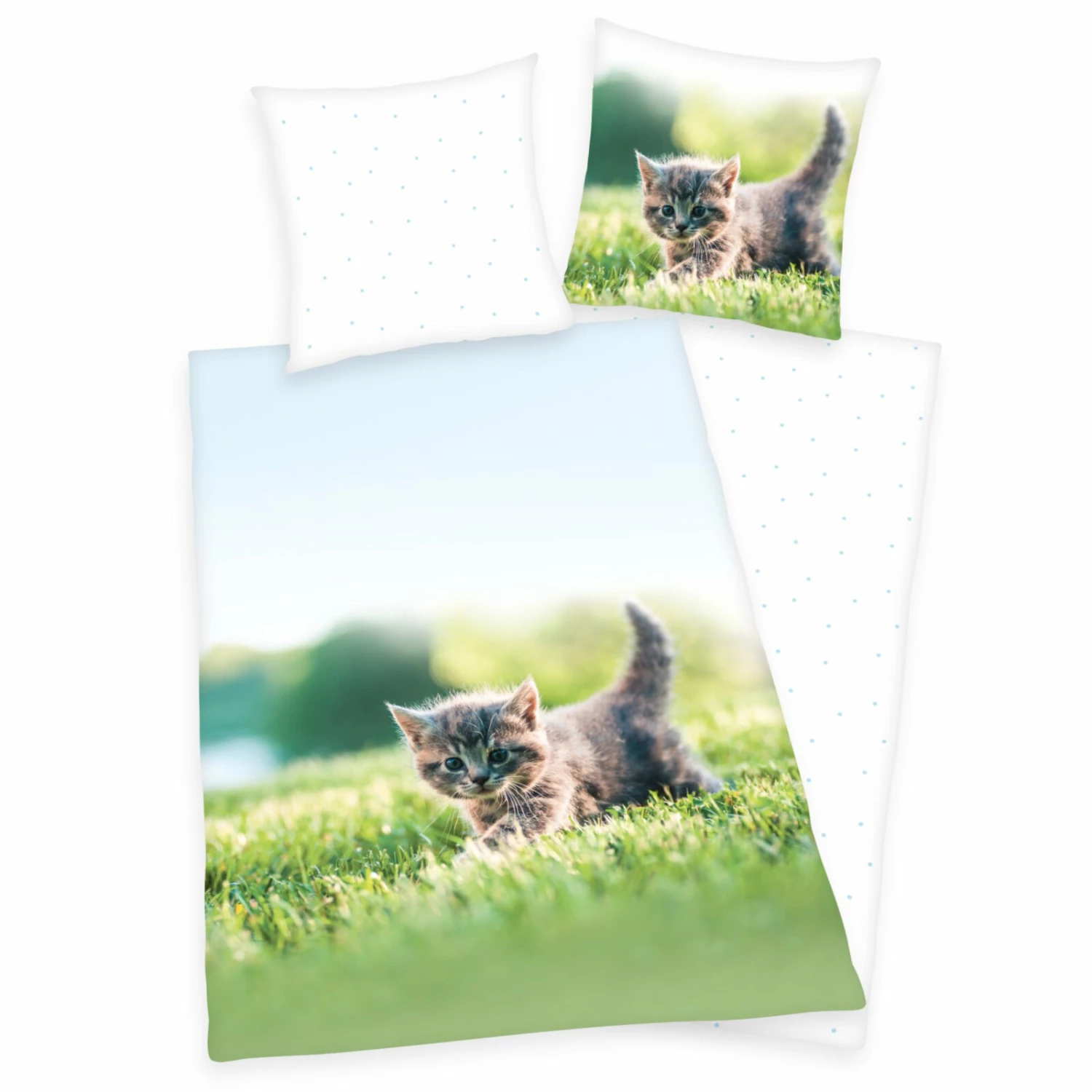 Ein Muss für alle Katzenliebhaber! Diese Renforcé-Bettwäsche kommt mit einem schönen Wende-Motiv daher. Auf der einen Seite befindet sich ein Bild mit einem Kätzchen auf einer Wiese, die andere Seite ist mit blauen Punkten versehen. Sie ist bei bis zu 60°C waschbar und besteht aus 100% Baumwolle.