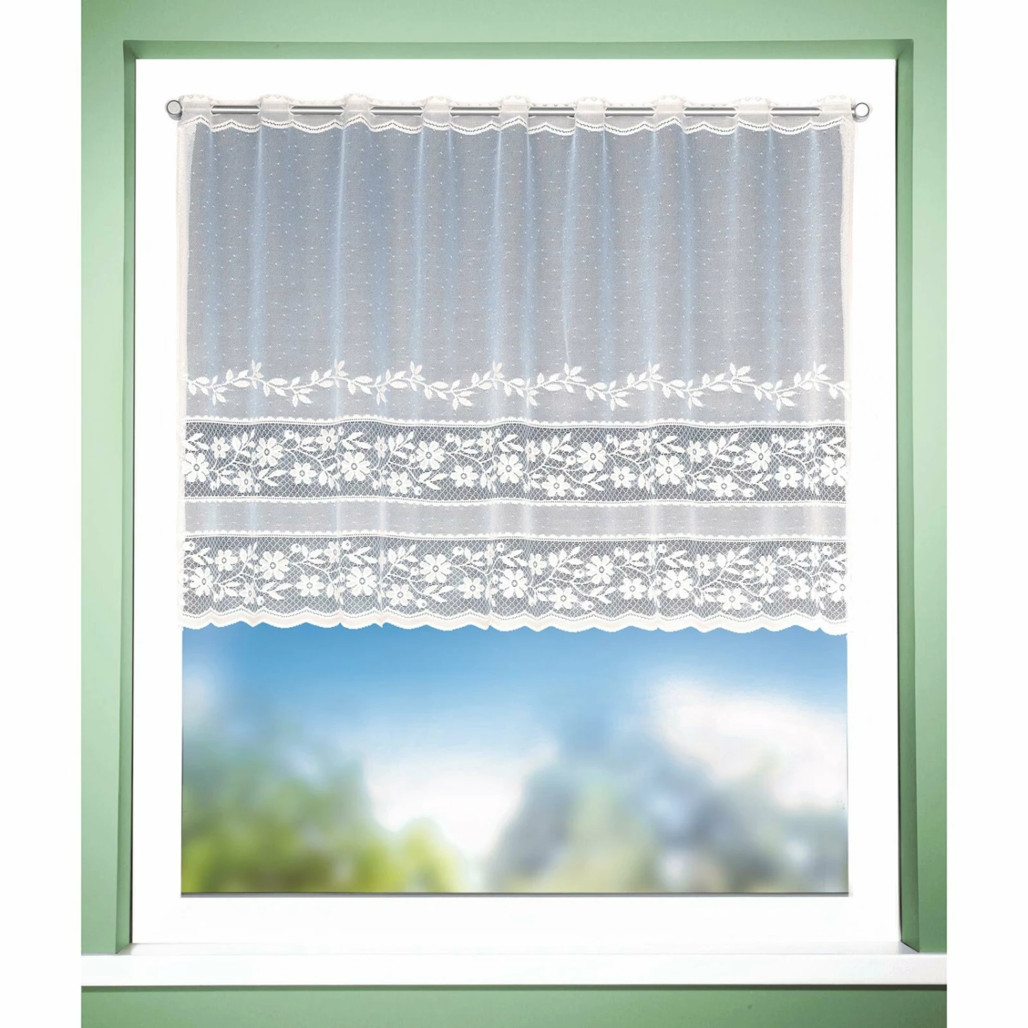 Die etwa 140 Zentimeter breite Scheibengardine verfügt über ein schönes Blumemuster und wird in Ihrem Raum für ein wohnliches Ambiente sorgen. Sie wird ein schönes Dekoelement für Ihr Fenster sein und lässt sich bei 30°C waschen.