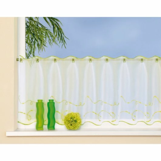 Diese wunderschöne Scheibengardine verleiht Ihren Fenstern eine toll Optik und sorgt für eine wohnliche Atmosphäre. Die grünen Stickereien sind ein stilvoller Hingucker.