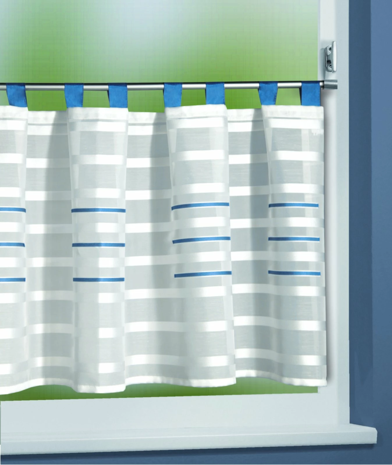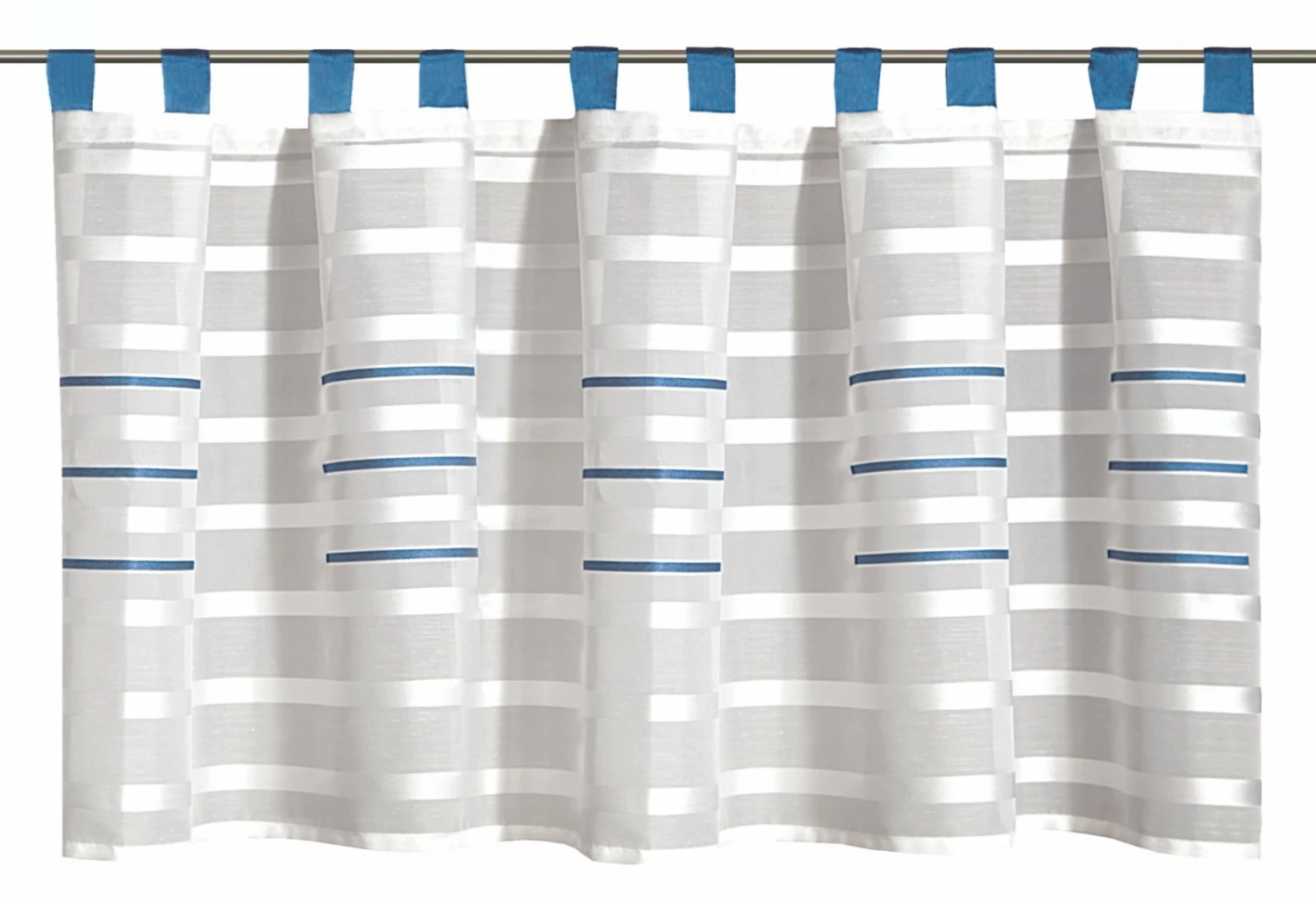 Schönes Panneau für Ihre Fenster. Die weiße Scheibengardine ist mit dichter gewebten weißen und blauen Streifen durchzogen, die eine ansprechende Musterung ergeben. Für den Stangendurchzug sind zehn Schlaufen vorhanden. Diese sind ebenfalls blau und in Seidenoptik, so dass ein edler Schimmer entsteht.