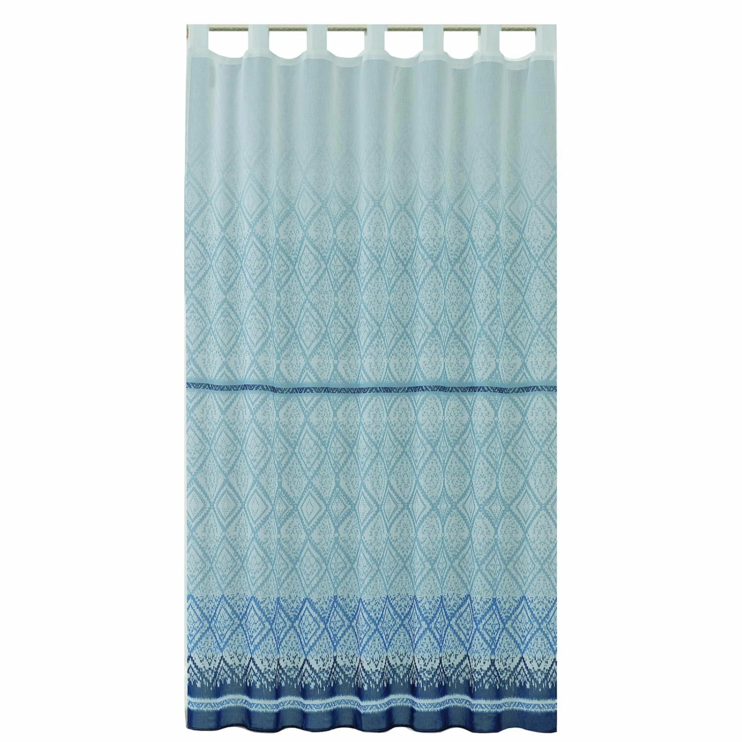 Im maritimen Look und mit einer Breite von etwa 145 Zentimetern präsentiert sich dieser schöne Schlaufenschal. Der blaue Stoff ist verdunkelnd und wurde aus robustem Polyester gefertigt. Dieser lässt sich bis zu 40 Grad waschen und im Schonprogramm des Trockners trocknen.