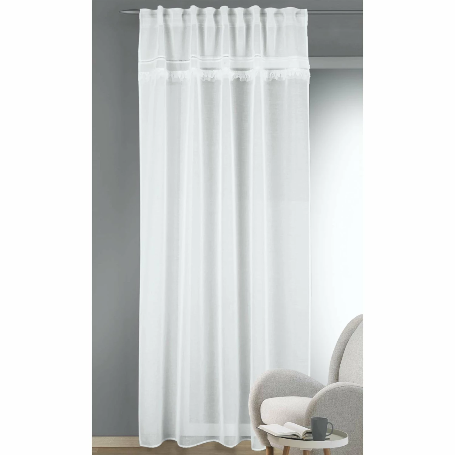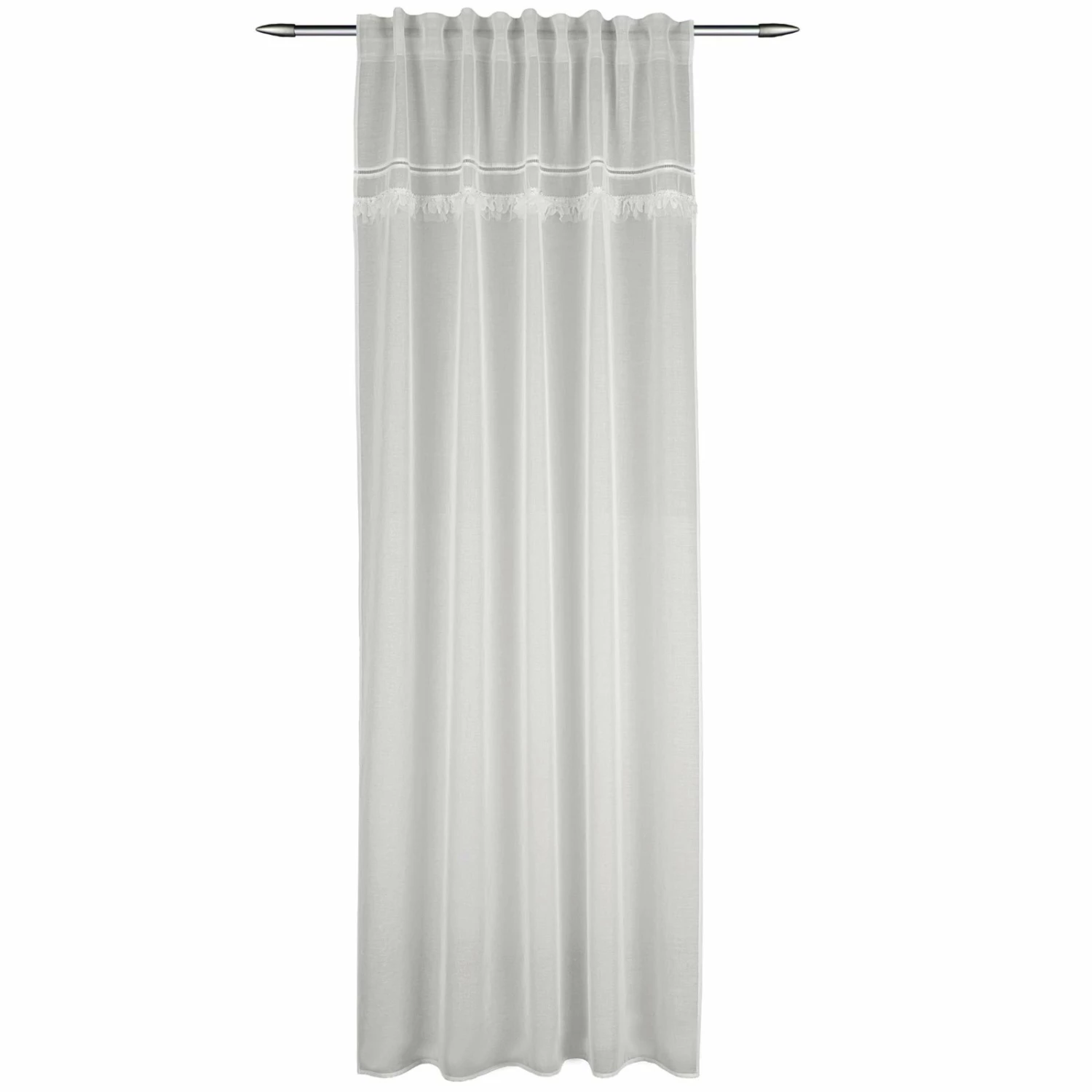 Transparenter Schlaufenschal in Offwhite mit abgesetzter Bordüre am oberen Rand. Die Bordüre ist ein echter Hingucker bei diesem zeitlosen Vorhang.