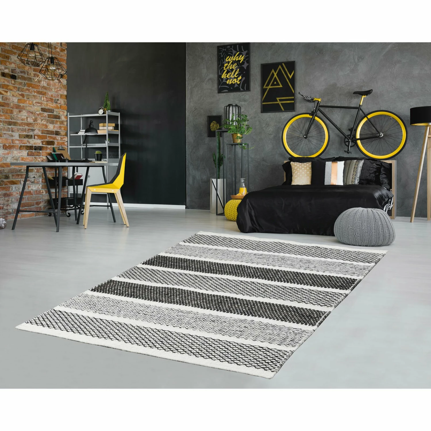 Handgewebt und mit einer tollen Musterung präsentiert sich dieser graue Teppich. Das Flormaterial wurde aus Schurwolle gefertigt und das Trägermaterial besteht aus Baumwolle. Der Teppich verleiht deinen vier Wänden nicht nur eine wohnliche Atmosphäre, zudem ist er auch für die Fußbodenheizung geeignet.