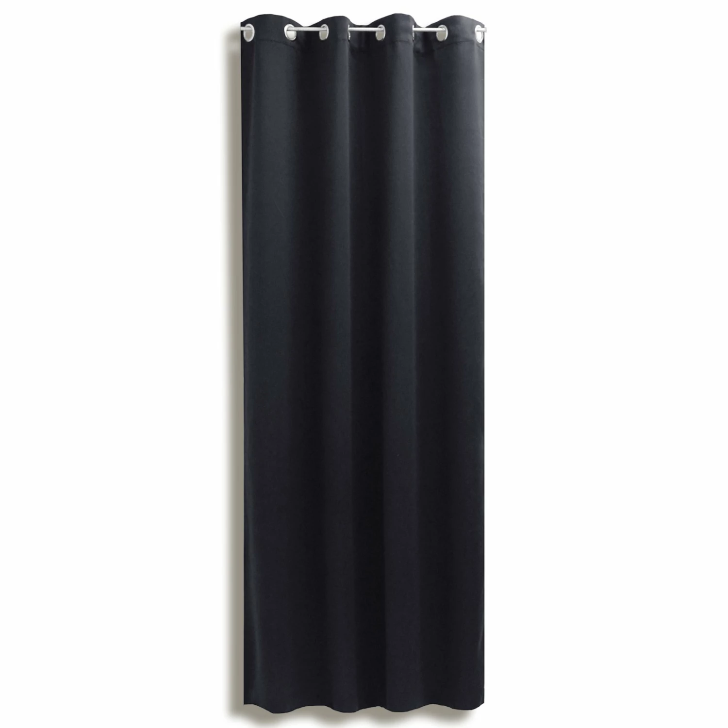 Schwarzer Verdunklungsvorhang aus Polyester mit 8 silberfarbenen Metallösen. Polyester ist besonders pflegeleicht und verschmutzt nicht so schnell. Der Stoff des 1,75 Meter langen Vorhangs ist blickdicht und kann zugezogen Ihre Wohnräume bei Bedarf verdunkeln.